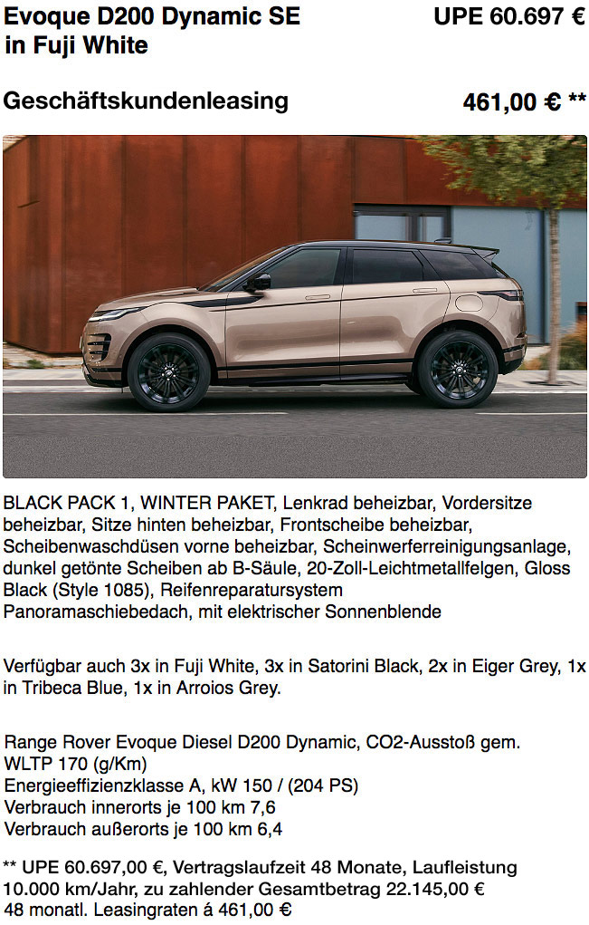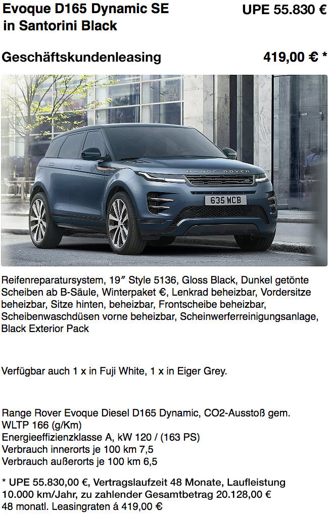 Evoque Fahrzeuge verfügbar z.T. ab sofort, z.T. ab Januar 2025. Die Leasingangebote sind zzgl. 1.218,50 € Bereitstellung.